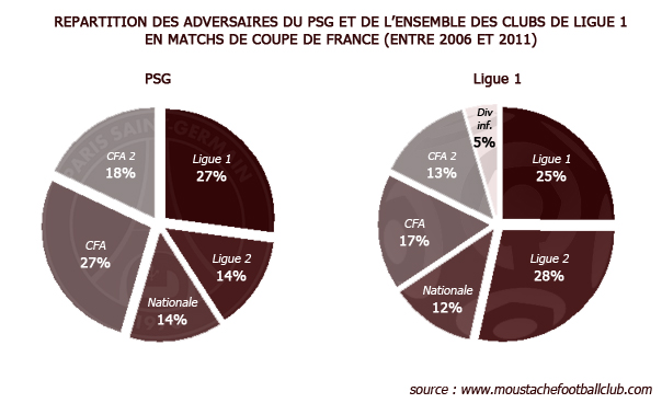 - Si il existe un avantage pour les Parisiens, il s’explique par la sous représentation du nombre de confrontations avec les clubs de Ligue 2 et la sur représentation avec les clubs de CFA. En 5 ans, le PSG a affronté autant de clubs de Ligue 1 que de CFA...