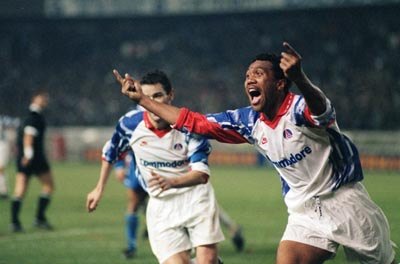 Antoine Kombouaré après son but face au Real Madrid en 1993. Encore aujourd'hui, l'ancien défenseur et entraîneur occupe une place particulière dans le coeur des supporters