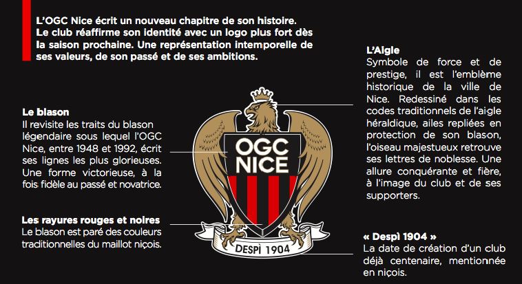 Simple, voir austère, le nouveau logo de l'OGC Nice est présenté par le club comme le fruit d’une démarche associant tous les acteurs du club : dirigeants, joueurs et supporters. Il en résulte un blason somme toute consensuel mais peut être un peu trop passe-partout. L’aigle, symbole de la ville, est sur-représenté par rapport au précédent blason (il trônait précédemment au dessus du logo). Une manière de rendre la pareille à la municipalité qui s’est saignée pour la construction de l’Allianz Riviera ?