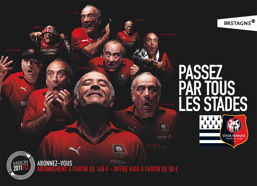 Deux campagnes d'abonnement ont particulièrement retenu notre attention, celle du Stade Rennais tout d'abord, où un supporter est représenté plusieurs fois passant par différents stades d'émotions en assistant à un match de football. Une idée qui se démarque du reste des équipes de Ligue 1 mais qui peut d'une certaine manière être sujet de moquerie, démonstration.